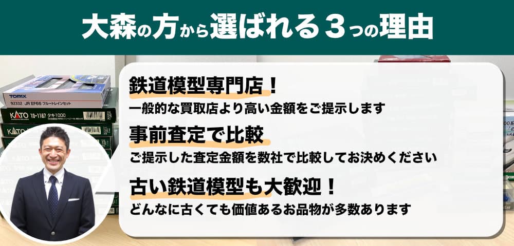リストが間違っていたなど、本来あるはずの模型が無いなど想定外のケースでなければ当初ご案内した金額より高く買取いたします。出張前にご案内した金額は大森駅周辺の買取ショップより安いということはないはずなので、気になる方は他のところで同様に査定してもらい比較なさってください。きっとご満足いただけるはずです。