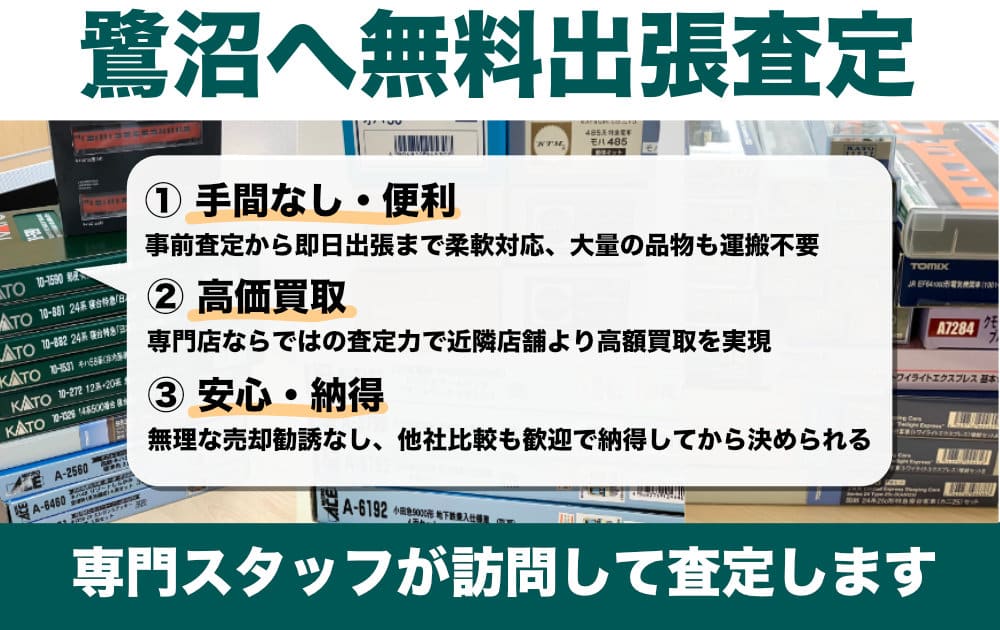 鷺沼なら当店から近距離のため即日出張査定いたします!鷺沼駅周辺にも買取店はいくつかありますが、当店は鉄道模型専門だからこその高価買取が可能です。総合リサイクル店では鉄道模型の希少価値や市場相場を正確に評価できないケースも多く、本来の価値より安く査定されてしまうことも。当店では長年の実績と専門知識で、N・HOゲージはもちろん、メーカーや年代による価値の違いまでしっかり見極めます。重い鉄道模型を店舗まで運ぶ必要もありません。ご自宅で保管している鉄道模型・グッズをその場で拝見し、納得いただける査定額を提示いたします。出張査定しても金額に不満があれば売る必要は一切ありません。当店からしつこく売却を求めることも絶対にありませんのでご安心ください。まずはお気軽にお問い合わせを。