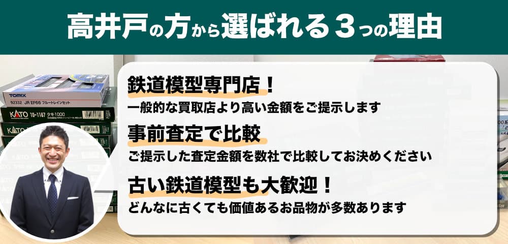 お持ちの鉄道模型を一覧にしたものをメール等でお知らせください。一覧からすべての鉄道模型を1品ずつ査定して金額をお知らせします。その金額以上での買取を保証して高井戸へ出張いたします。出張を使っても安くなってしまうことはありませんのでご安心ください。鉄道模型はどんなに古くても欲しい人がいるものです。数年前・数十年前に集めた模型も次に欲しいユーザー様にとっては大変貴重な鉄道模型となります。欲しい人へ繋ぐことをお手伝いいたします!