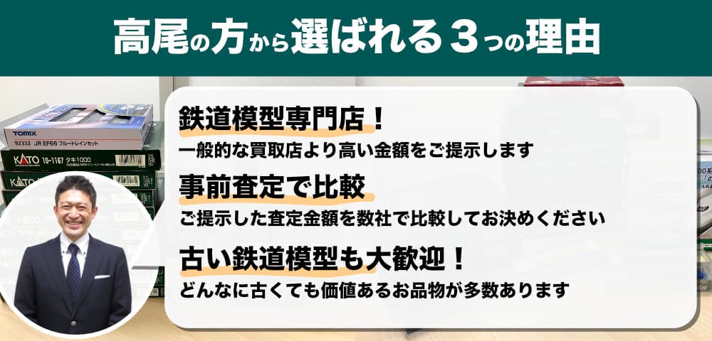また、鉄道模型を購入したところへ持って行ったところ、「査定が安くてがっかりした」という声を聞くこともあります。当店の金額が必ず高いとは言い切れませんが、専門店として他店以上になるよう常に査定金額を精査しているため、高尾周辺の店と比較したら高くなっている可能性が高いと思います。
